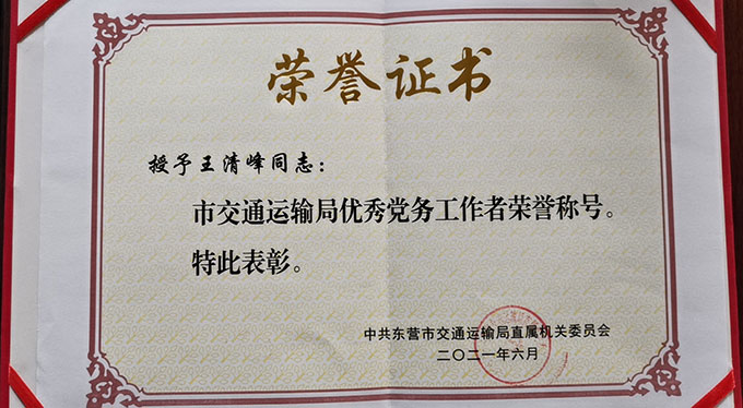• 王清峰榮獲“市交通運輸局優秀黨務工作者”